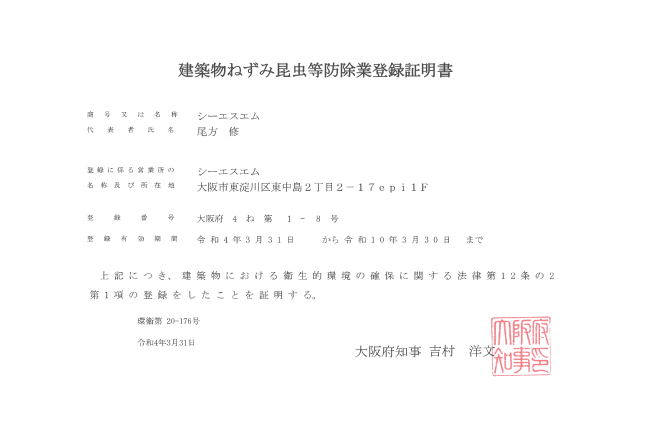 当社は、厳しい基準をクリアした大阪府認定業者です。